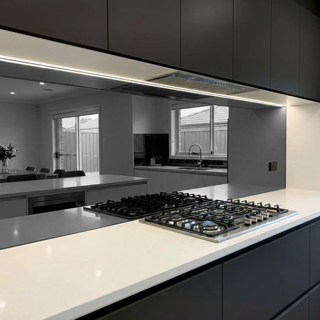 Browse the full glass splashbacks collection for painted, printed, coloured, and clear options alongside mirror.